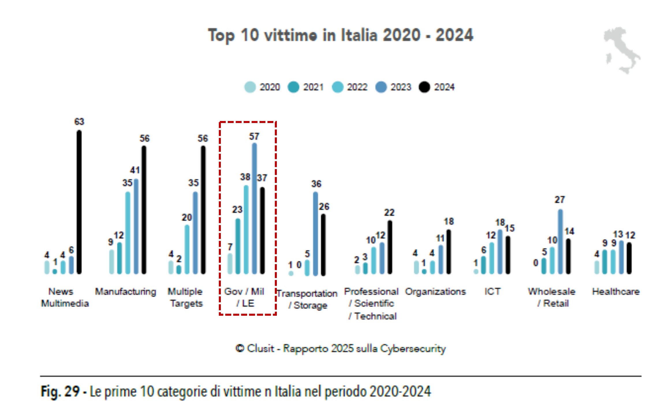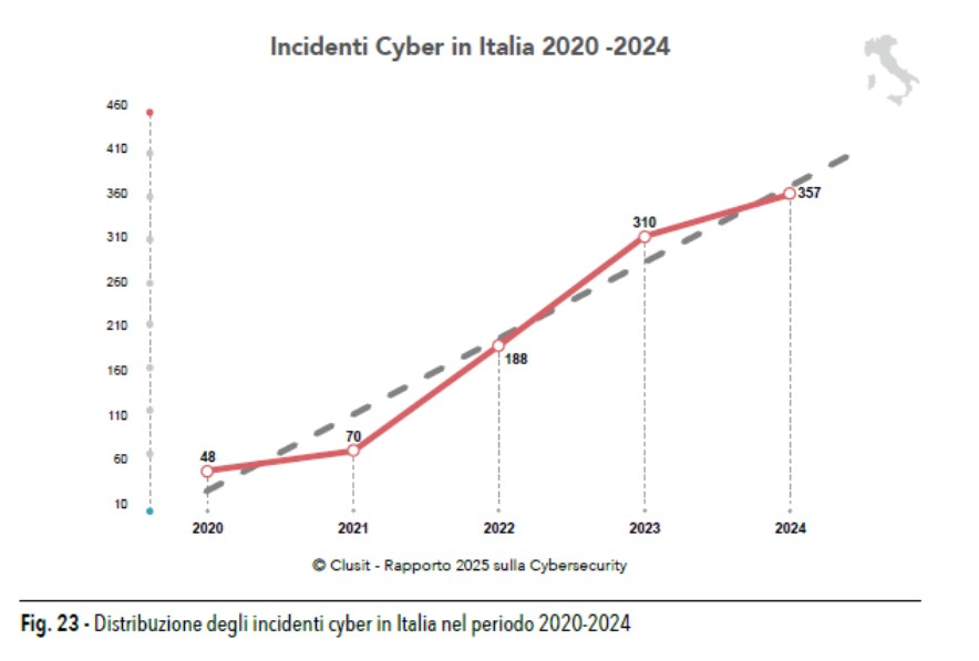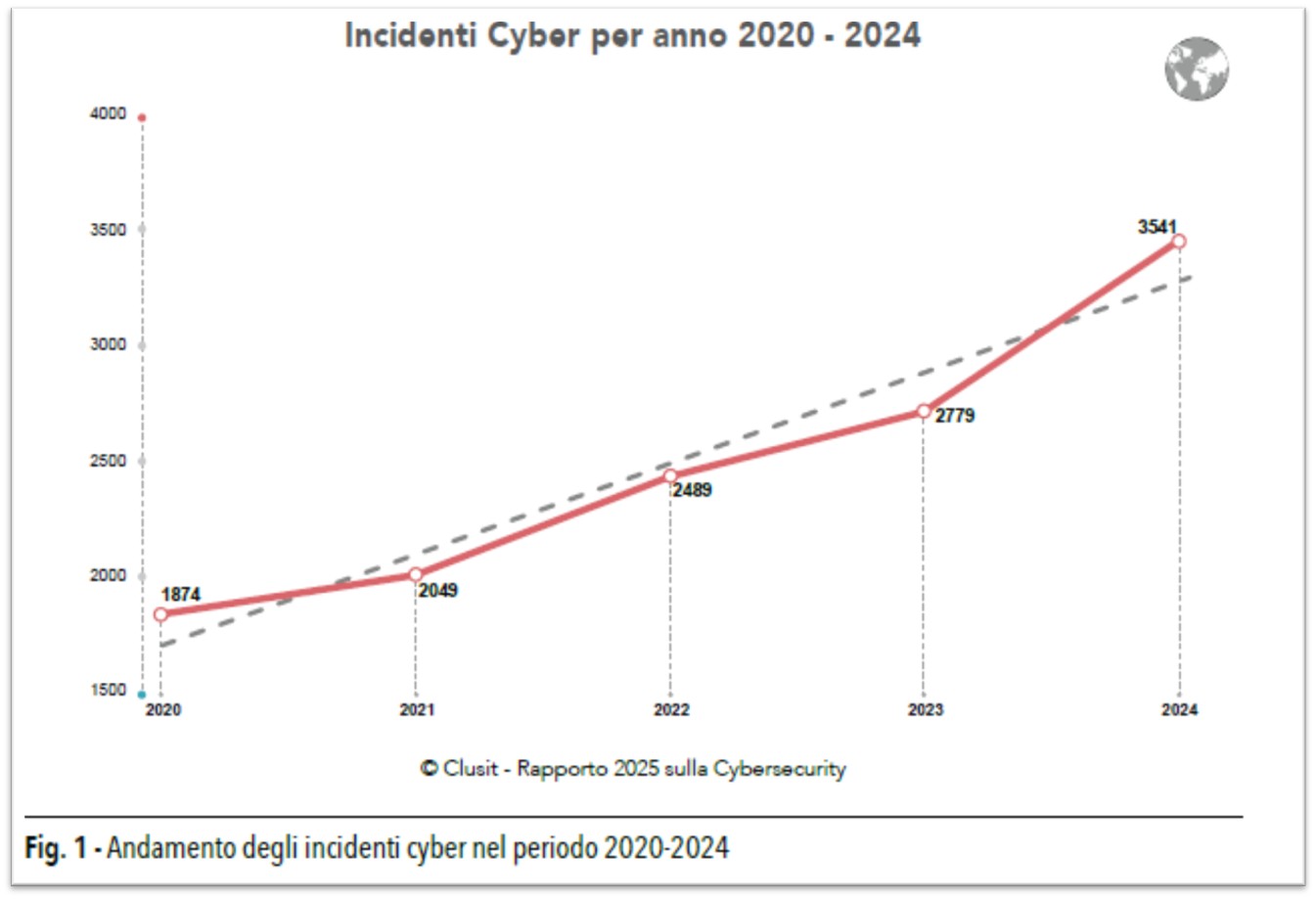 Negli ultimi cinque anni, il numero di incidenti cyber ha registrato una crescita notevole e il settore pubblico (Pubblica Amministrazione, Sanità, Istruzione) è stato interessato da un importante aumento del numero degli "incidenti rilevanti" fra il 2020 e il 2024. Per "incidente rilevante" si intende un attacco cyber andato a buon fine e di particolare gravità, che ha comportato un impatto significativo per la vittima in termini economici, tecnologici, legali o reputazionali.