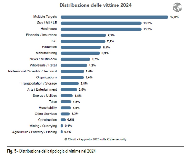Nel nostro Paese il settore dei servizi e la Pubblica Amministrazione confermano il primato di target preferito, con una breve flessione nel 2024 per la PA. Se sommiamo PA e Sanità, otteniamo, ancora una volta, il non proprio ambito primo posto.