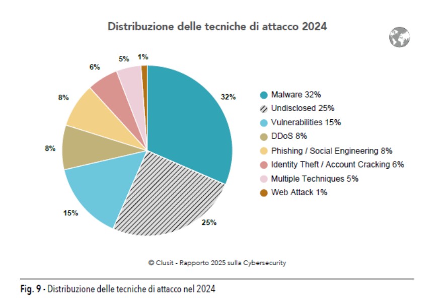 La seguente figura, infine, riporta la distribuzione delle tecniche di attacco utilizzate relative agli incidenti rilevanti del 2024.